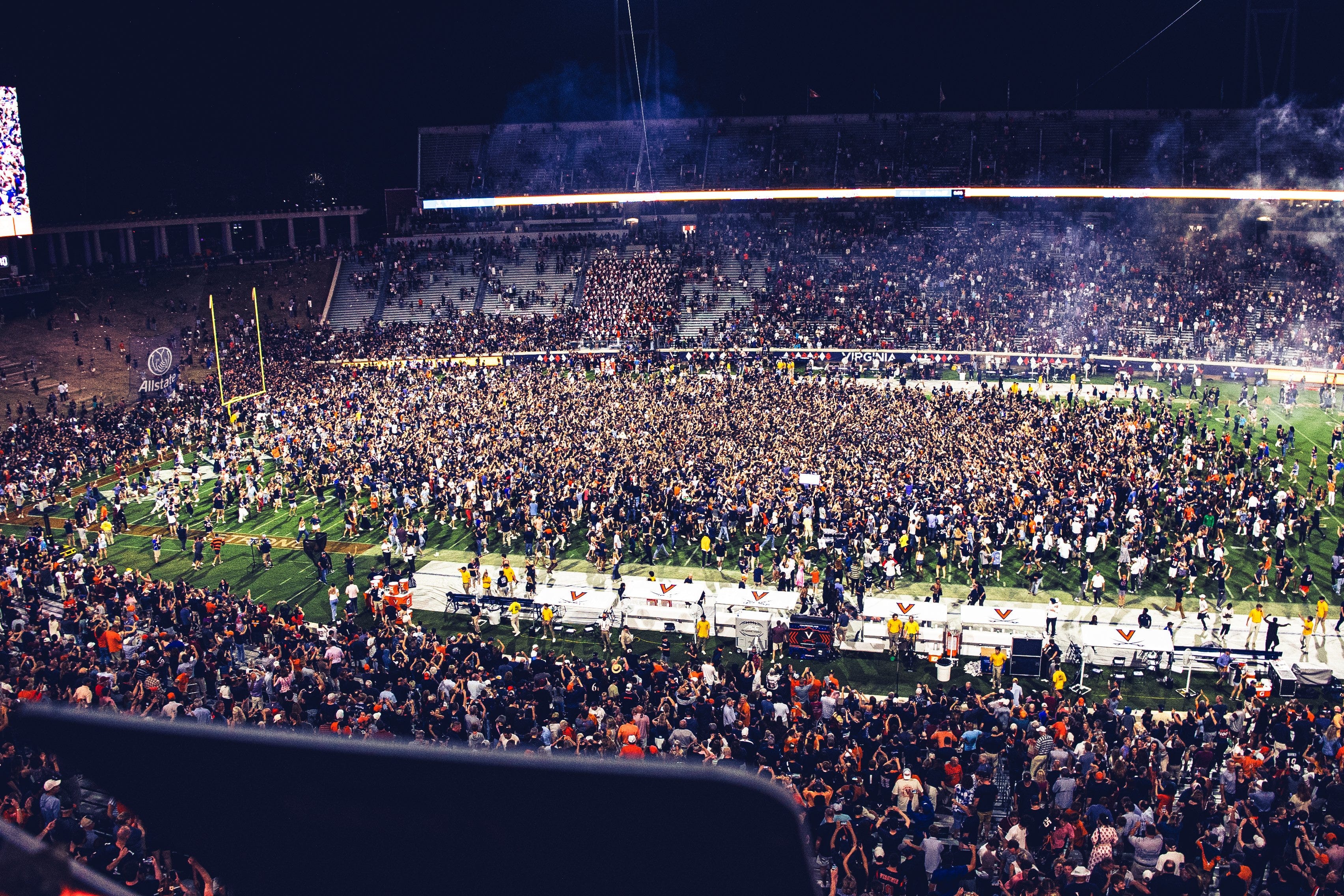 Virginia fans storm the field after defeating #8 Florida State for their first victory over a Top 10 at home since 2005 (UVAFootball/X).